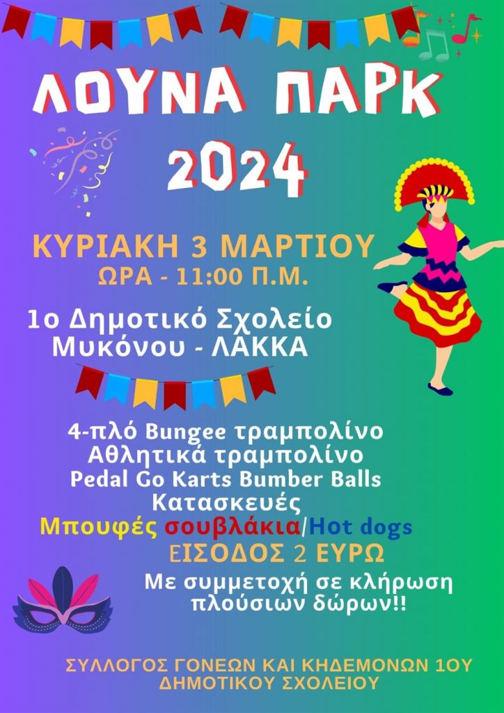 Mykonos Carnival / Ο Σύλλογος Γονέων και Κηδεμόνων του 1ο Δημοτικό Σχολείο Μυκόνου σας προσκαλεί στο Αποκριάτικο «Λούνα Πάρκ» που διοργανώνει, την Κυριακή 3 Μαρτίου 2024, στον αύλιο χώρο του σχολείου, στην Λάκκα Χώρας Μυκόνου.