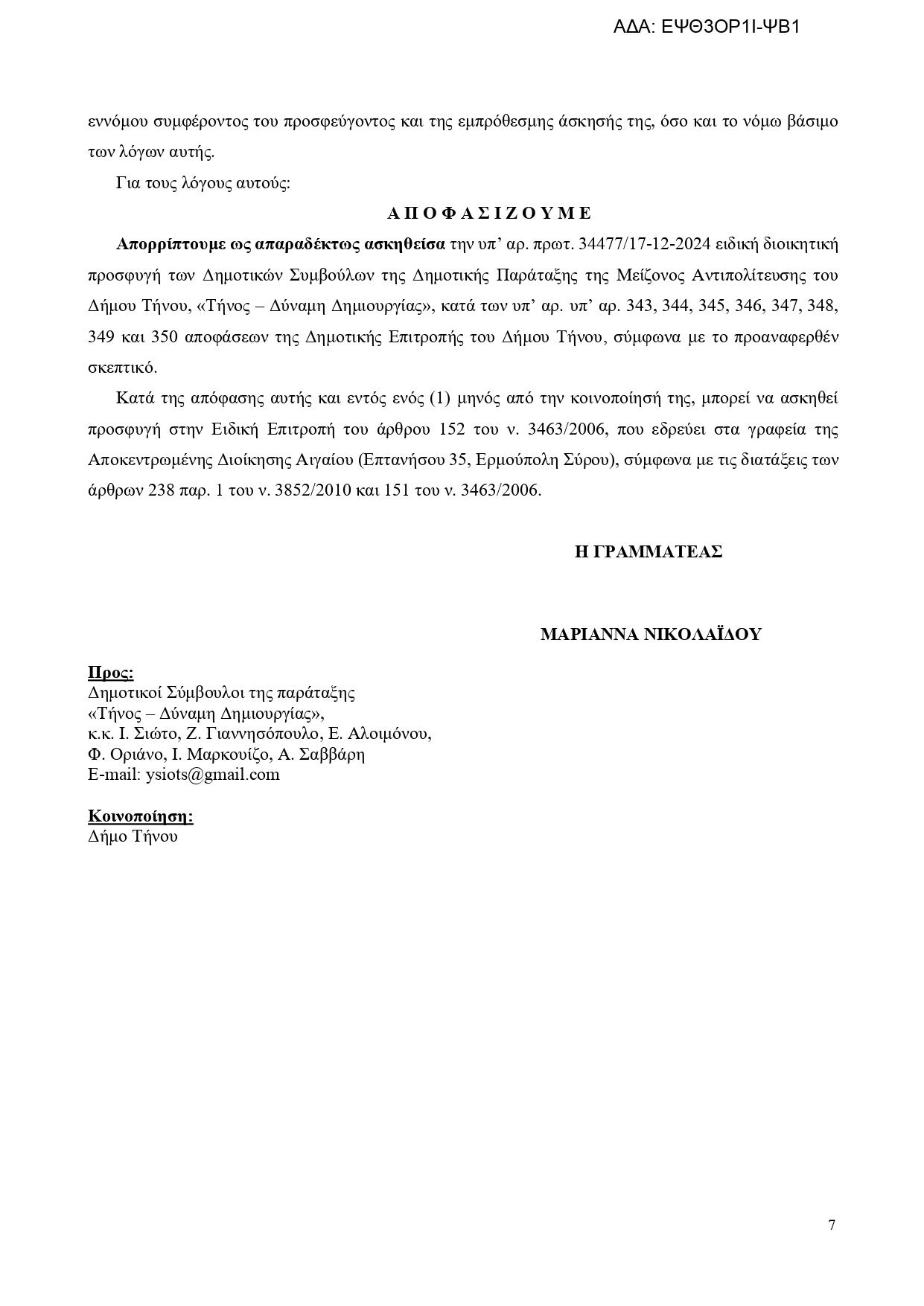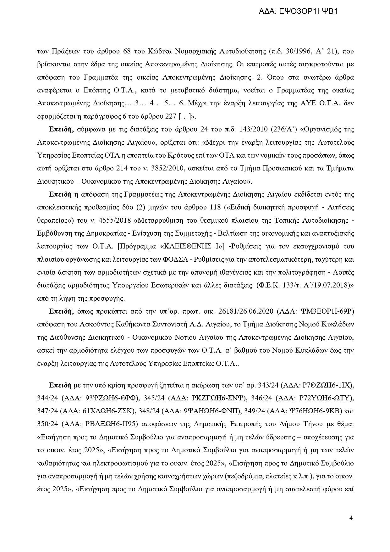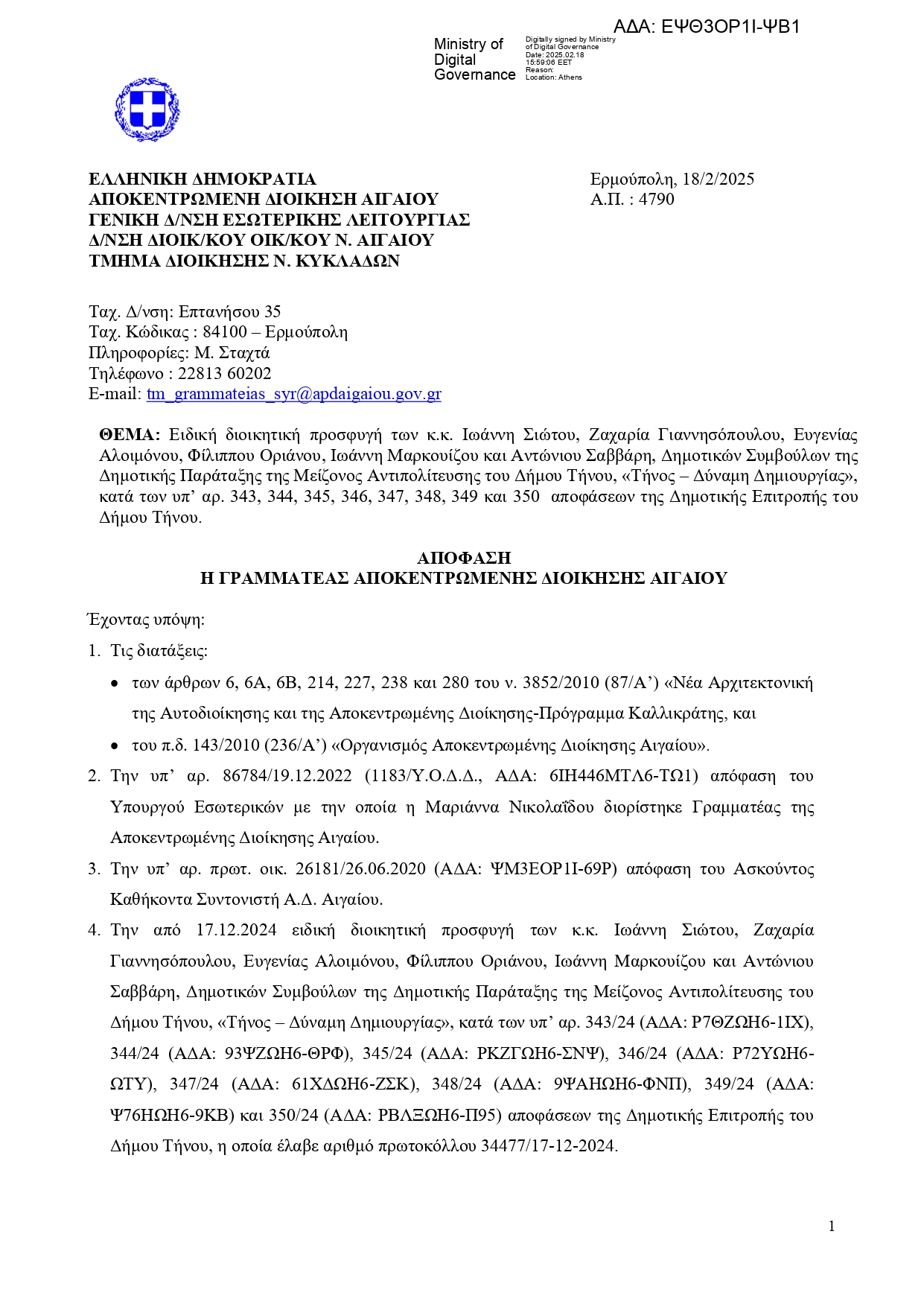 Η Αποκεντρωμένη Διοίκηση Αιγαίου απέρριψε, και μάλιστα με την υποσημείωση ως “απαράδεκτες”, τις προσφυγές της αξιωματικής αντιπολίτευσης του Δήμου Τήνου, οι οποίες είχαν στόχο την παρεμπόδιση του έργου της σημερινής Δημοτικής Αρχής.