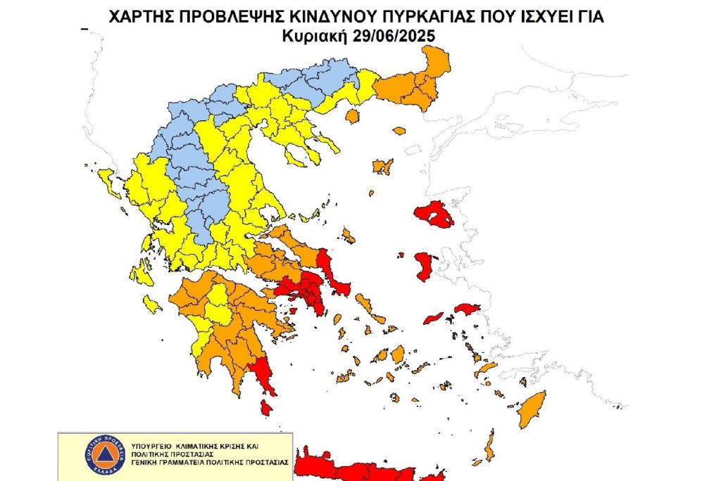 Ακραίος κίνδυνος πυρκαγιάς – Κατάσταση Συναγερμού (κατηγορία κινδύνου 5) προβλέπεται αύριο σε Αττική, Κρήτη, Κύθηρα, Εύβοια, Λακωνία και περιοχές του Βορείου Αιγαίου, σύμφωνα με τον Χάρτη Πρόβλεψης Κινδύνου Πυρκαγιάς, που εκδίδει η Γενική Γραμματεία Πολιτικής Προστασίας του Υπουργείου Κλιματικής Κρίσης και Πολιτικής Προστασίας.