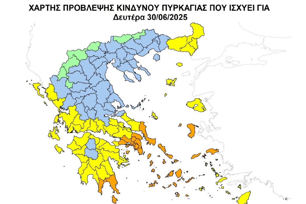 Πολύ υψηλός κίνδυνος για πρόκληση φωτιάς σε 11 περιοχές της χώρας σύμφωνα με τον χάρτη πρόβλεψης της Πυροσβεστικής για αύριο Δευτέρα (30/06).