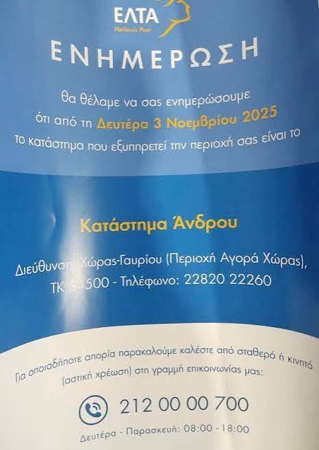Mayor of Andros: Ο Δήμαρχος Άνδρου Θ. Σουσούδης, επισημαίνει ότι, αποτελεί τεράστιο πλήγμα το κλείσιμο του καταστήματος των ΕΛΤΑ στο Λιμάνι του Γαυρίου!!