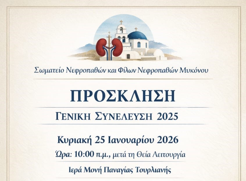 Σε μια κρίσιμη καμπή για τον σχεδιασμό των δράσεων της νέας χρονιάς, το Σωματείο Νεφροπαθών και Φίλων Νεφροπαθών Μυκόνου απευθύνει ανοιχτό κάλεσμα στα μέλη του για την ετήσια Γενική Συνέλευση. Η εκδήλωση, που συνδυάζει τον θεσμικό ρόλο του σωματείου με την παράδοση, θα πραγματοποιηθεί την Κυριακή 25 Ιανουαρίου 2026, στο πνευματικό κέντρο του νησιού, την Άνω Μερά.